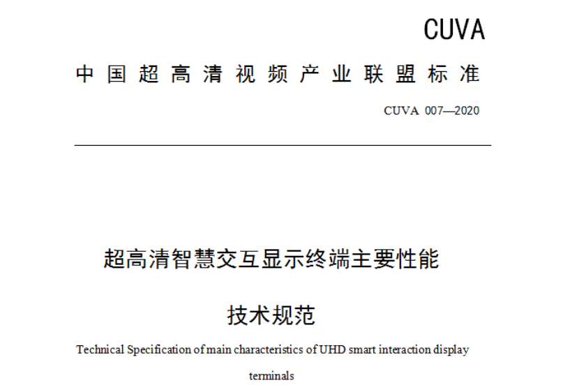 2020年11月26日,由中国电子正在上传...技术标准化实验室牵头制定的 CUVA 007-2020《超高清智慧交互显示终端主要性能技术规范》,经中国超高清视频产业联盟标准制定工作组广泛征求意见、讨论报批,现正式公开发布。