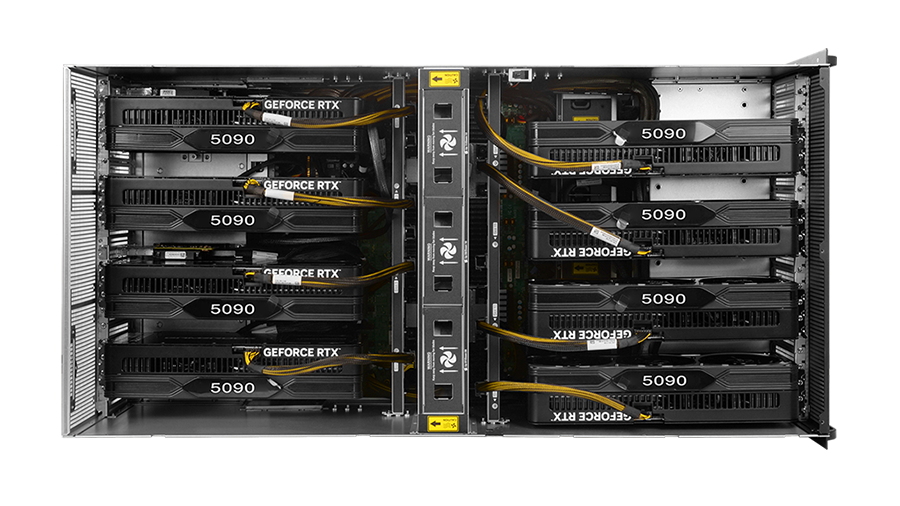 直通8卡AI服务器涡轮版:支持 8 张 600W 2 宽、2.5 宽 RTX 5090 涡轮卡或其他 600W 涡轮卡 GPU,GPU 采用 8 卡后置并排集中风道散热布局, 最大支持 GPU 宽度 50mm
